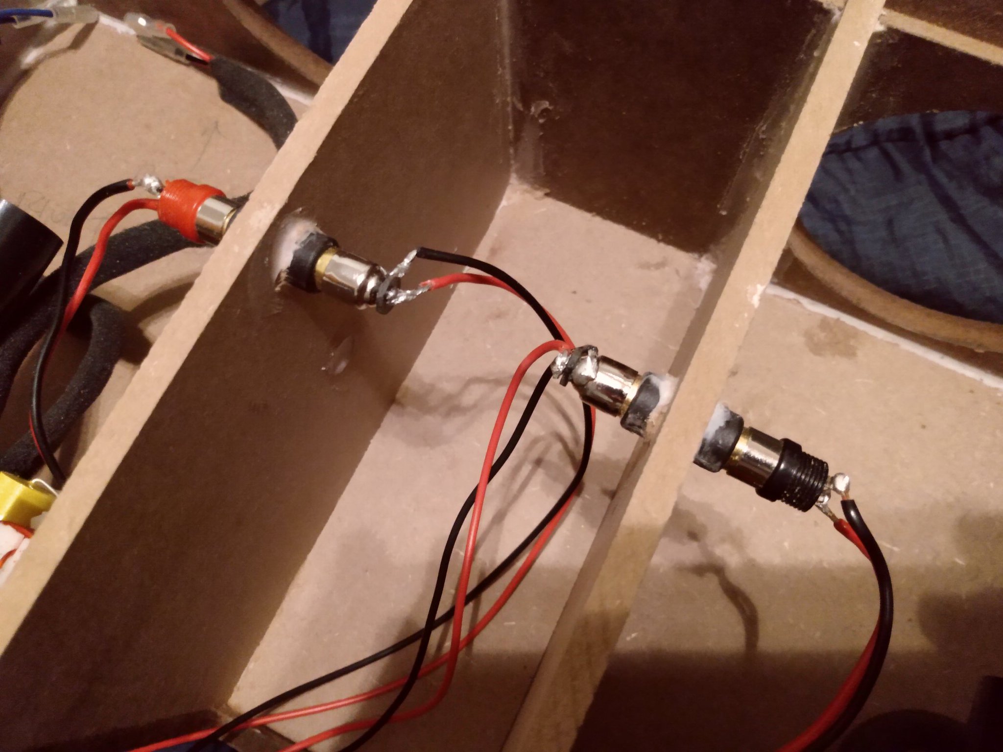 I would change the end baffles so they could be bolted. They'll be glued on top of square dowel used as a rebbit joint. It's a little bit of a pain, and the end caps can't be bolted. As shown below, they're not installed yet, as I'm keeping the sides and the front open for access while I install the electronics. That gave me the idea of having the front center piece of the boombox be removable, so I can upgrade later on to some fancy front panel or even a tablet. I'm a little afraid of vibrations that might occur with that cover so I'll have to play it by ear, and if I have to glue it, I will. For the moment I was able to stain the whole cabinet, and a few minutes ago I made the perforations for the ports which will use ~8 cm lengths of standard ¾ inch PVC pipe (Note to self: don't stain the box before cutting the port holes).