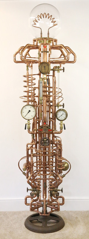 The idea behind the design is to try to make them look they have been made from much older machines that were designed (in some great and specific detail) to achieve a very specific function, even if that function is not entirely clear now. That might have been something to do with distillation, chemical mixing or separation, creation of some type of mixture / compound / liquid that required controllable pressure, flow, temperature (and cooling), and that this process could be controlled by an operator using the various working taps and valves, with readouts from the gauges etc.