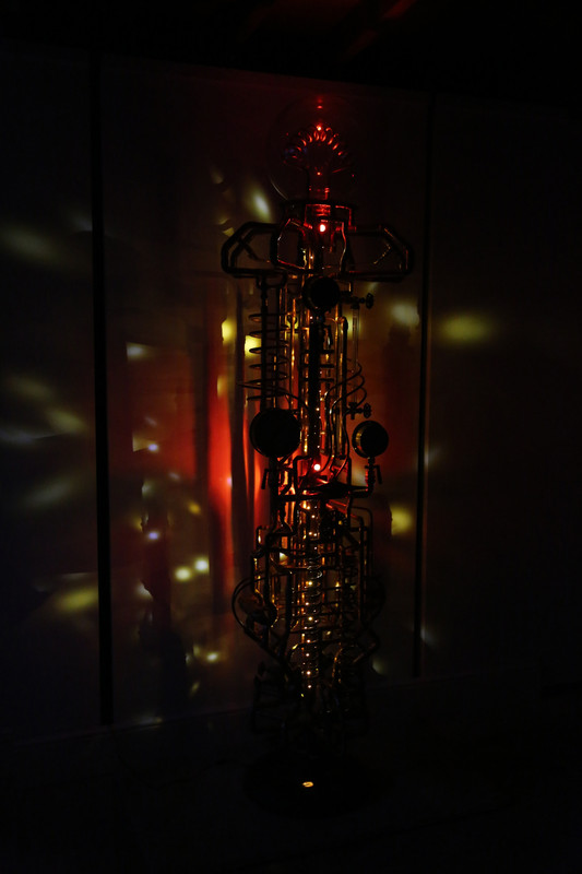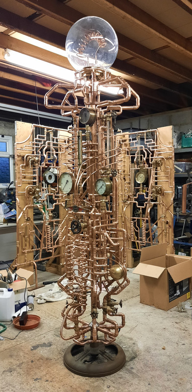 All gauges, thermometers etc work, sight glasses actually carry water, and there are many taps and valves to allow 'tuning' of the radiators to make sure they heat evenly. The free standing one also has very subtle lighting in the central tube (low voltage, waterproof and totally isolated from water).